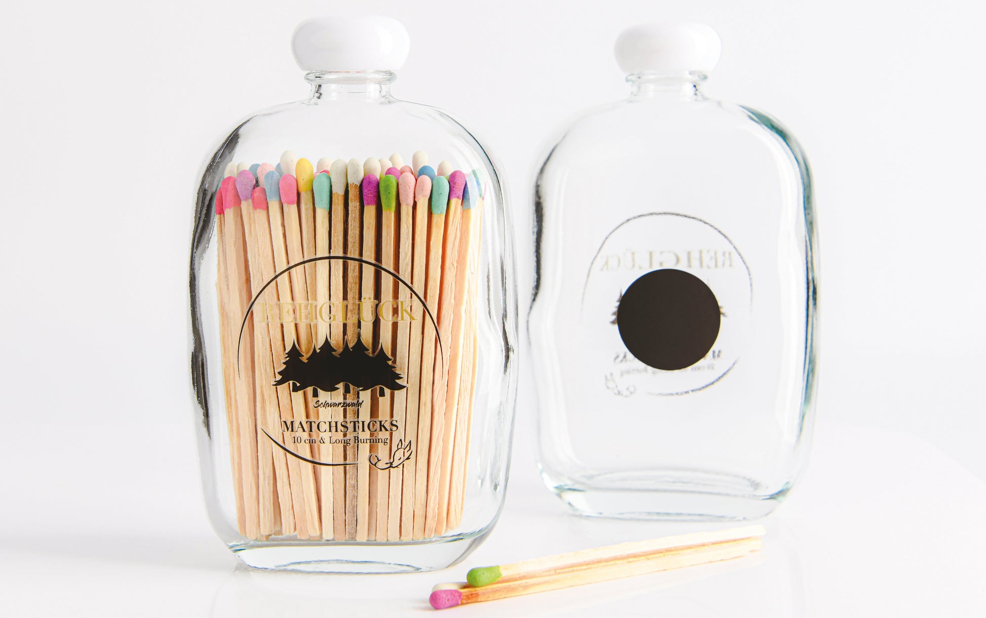 Abgerundete Taschenflasche im klassischen Look mit weißem Drehverschluss. Gefüllt mit je 80 Stück 10 cm langen Streichhölzern. Das Schlagpapier befindet sich auf der Rückseite der Flasche.